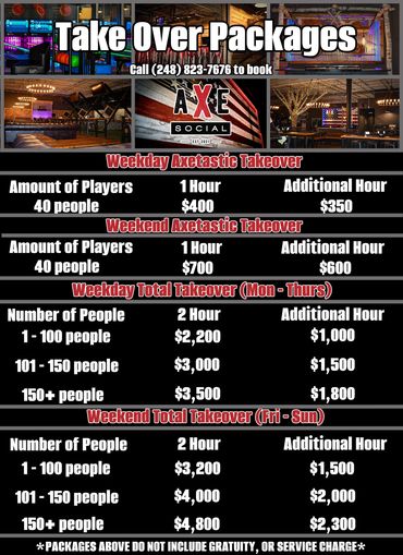 Looking for an amazing experience for your next event? The Axe Social has all you need and more to make your event a memory of a lifetime with exciting activities, amazing drinks, and food! Whatever your celebrating, we've got you covered!